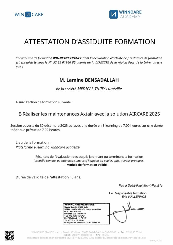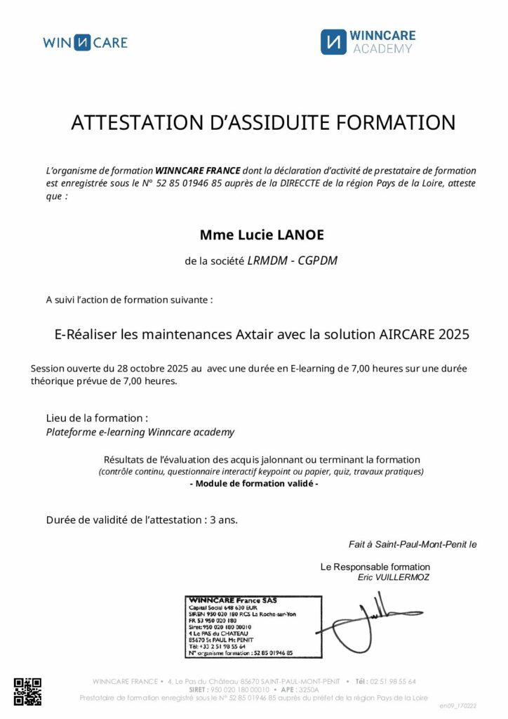 Attestation d’assiduité formation « E-Réaliser les maintenances Axtair avec la solution AIRCARE 2025 »