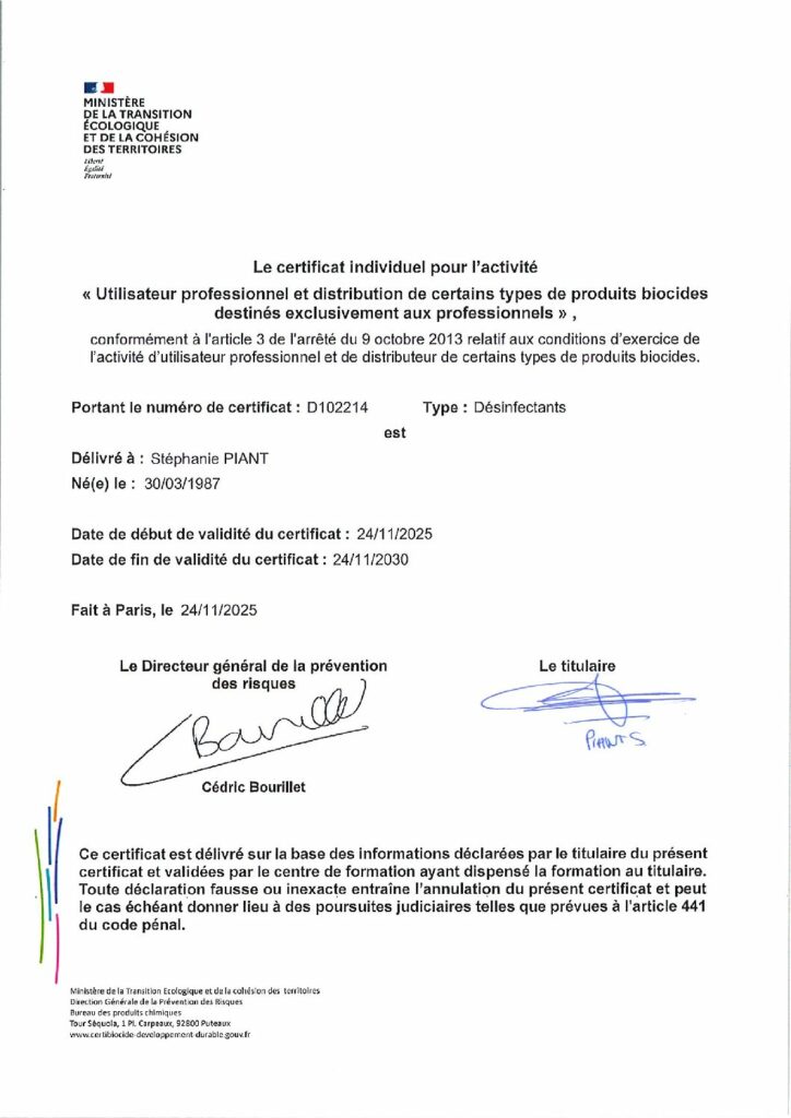 Certificat individuel pour l’activité « Utilisateur professionnel et distribution de certains types de produits biocides destinés exclusivement aux professionnels »